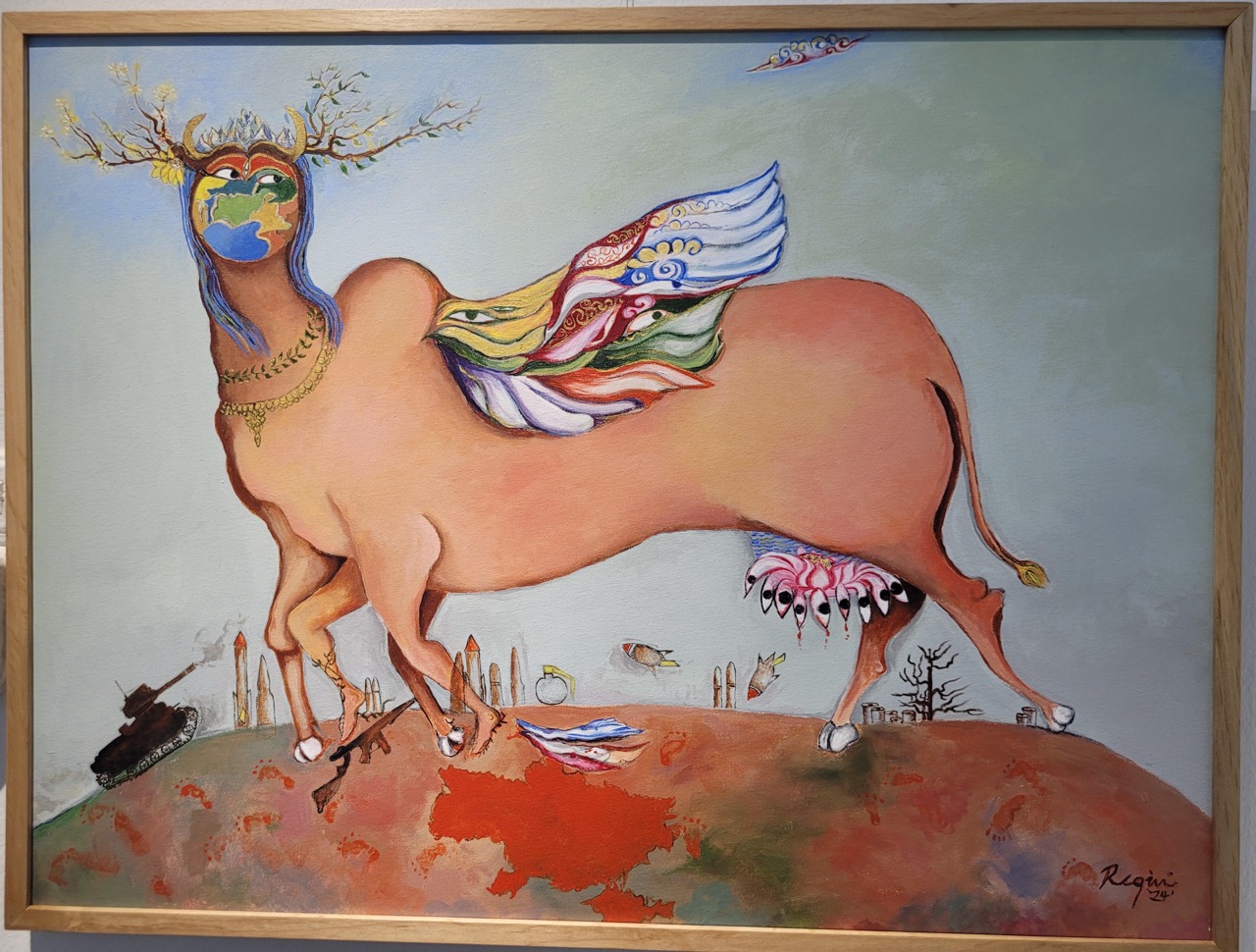 The beautiful Mother Goddess has now arrived in Ukraine! Our mother, Earth, is a stunning figure adorned with the colorful wings of dreams. Green nature forms her necklace, mountains her crown, and rivers her flowing hair. Her breasts are as soft as lotus petals. Innocent like a cow, our beautiful mother is in trouble. She now stands in Ukraine, with part of her wing broken and her lotus breasts weeping. She finds herself in a war-torn land, surrounded by dry trees and fields of weapons.